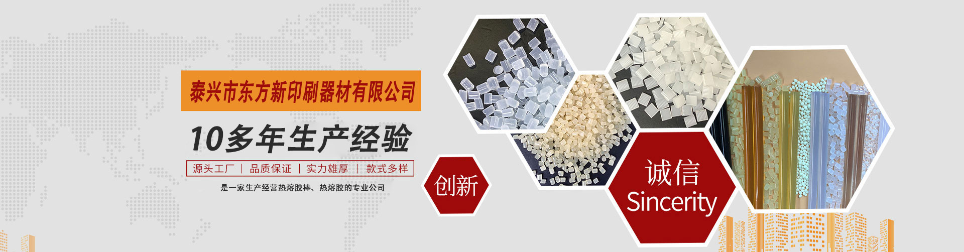 泰興市東方新印刷器材有限公司是專一生產(chǎn)綠色環(huán)保型印刷裝訂書刊熱熔膠,封箱包裝熱熔膠,吸管膠,鞋材熱熔膠,冰箱熱熔膠,熱熔膠棒,地毯背膠等。產(chǎn)品具有快速粘接、耐老化、強度高、熱穩(wěn)定性好、無毒害等優(yōu)點,廣泛用于無線膠訂、自動化封箱,飲料吸管粘結(jié)接,電子電器、工藝品、玩具、家具等領(lǐng)域,公司與多家科研機構(gòu)建立了緊密的戰(zhàn)略合作關(guān)系,質(zhì)量達到先進水平,產(chǎn)品已銷往全國30多個省市地區(qū),并出品到東南亞多個國家和地區(qū)。    公司堅持“誠信為本,貼心服務(wù)”為廣大顧客提供優(yōu)質(zhì)產(chǎn)品,董事長兼總經(jīng)理黃衛(wèi)東先生攜全體員工,竭誠歡迎各界朋友光臨指導(dǎo)、洽談合作、共贏同發(fā)展。    Taixing Dongfang New Printing Equipment Co., Ltd. specializes in the production of green and environmentall…